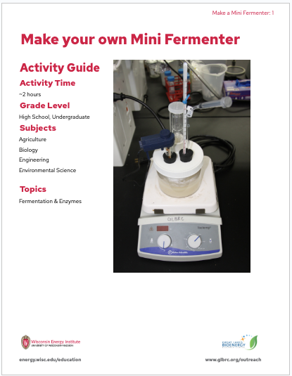 This mini fermenter can be used to conduct small-scale fermentation investigations or demonstrations similar to research done by GLBRC scientists. The design allows for students to use simple techniques and classroom-grade probes to collect data during fermentation on a range of variables, such as ethanol concentration, CO2 production, temperature and pH. The complete mini fermenter can be built with readily-available supplies for approximately $20 (detailed supplies list included with instructions).