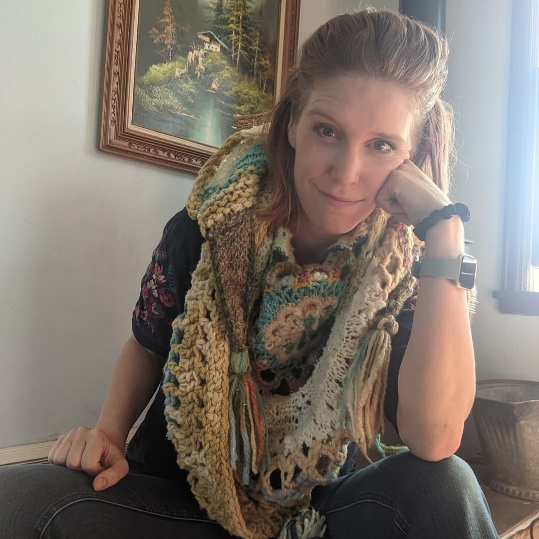 Portrait of Sarah Lloyd. She is a white woman with dark hair and glasses on. She is wearing a black and maroon shirt with a textured background behind her.